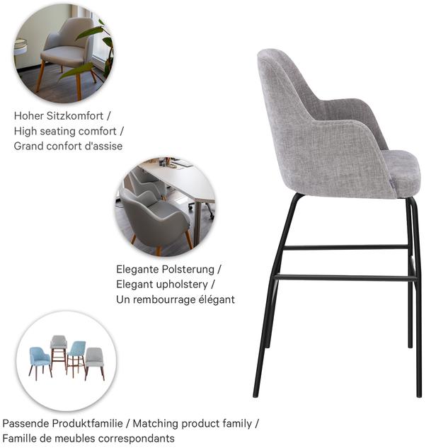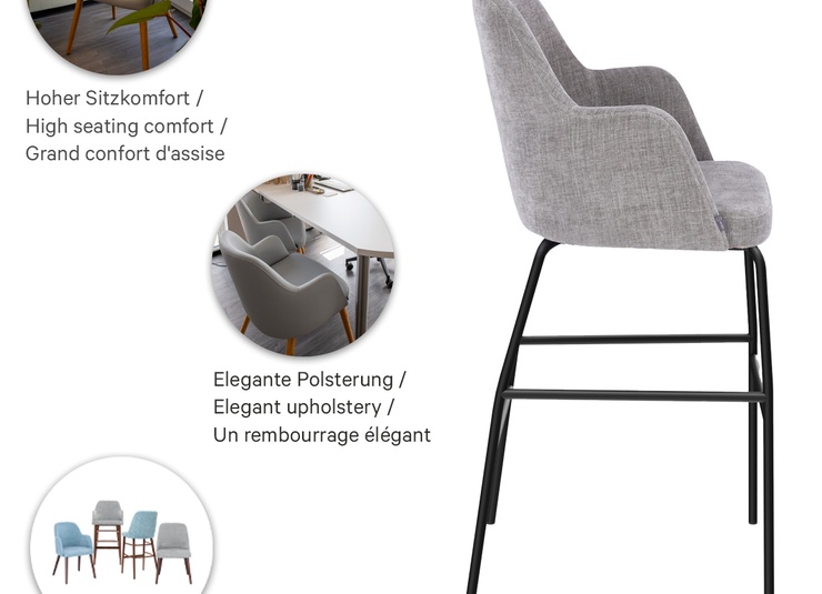 Timeless and classic, the Hada bar stool presents itself as the perfect complement to the Hada chair and armchair from the Retro Style Comfort family. For this particularly comfortable model, the upholstery fabrics Cosy and Minea as well as three bases are available: natural oak, Merano brown beech, or black with brass sleeves for an extravagant look. Alternatively, there is a frame made of black metal.- Timeless retro design: Hada looks classically high-quality and fits in restaurants, bars, and hotel lounges